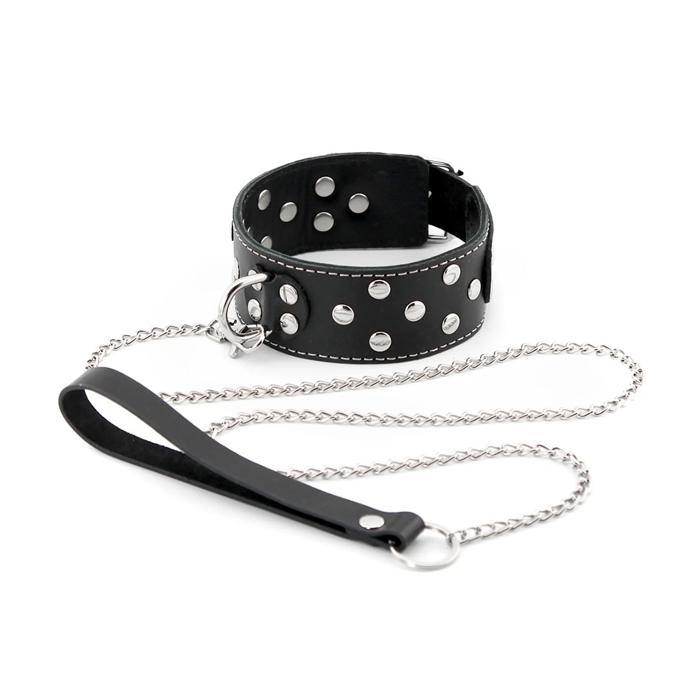 Чокер можно использовать как вместе с поводком, так и отдельно. Украшен блестящими заклёпками и белой декоративной строчкой, что делает его эффектным дополнением к сексуальному костюму или повседневному образу.